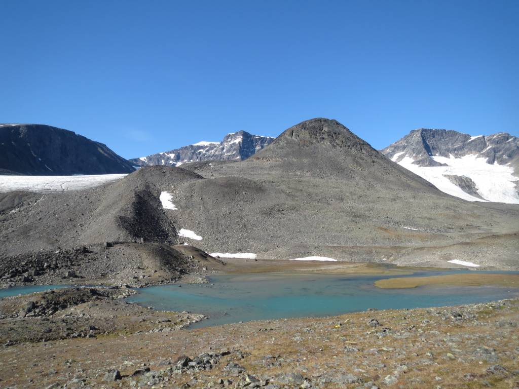 Im Hintergrund ein Schneegipfel: das ist das Ziel für morgen, Kebnekaise, höchster Berg von Schweden.